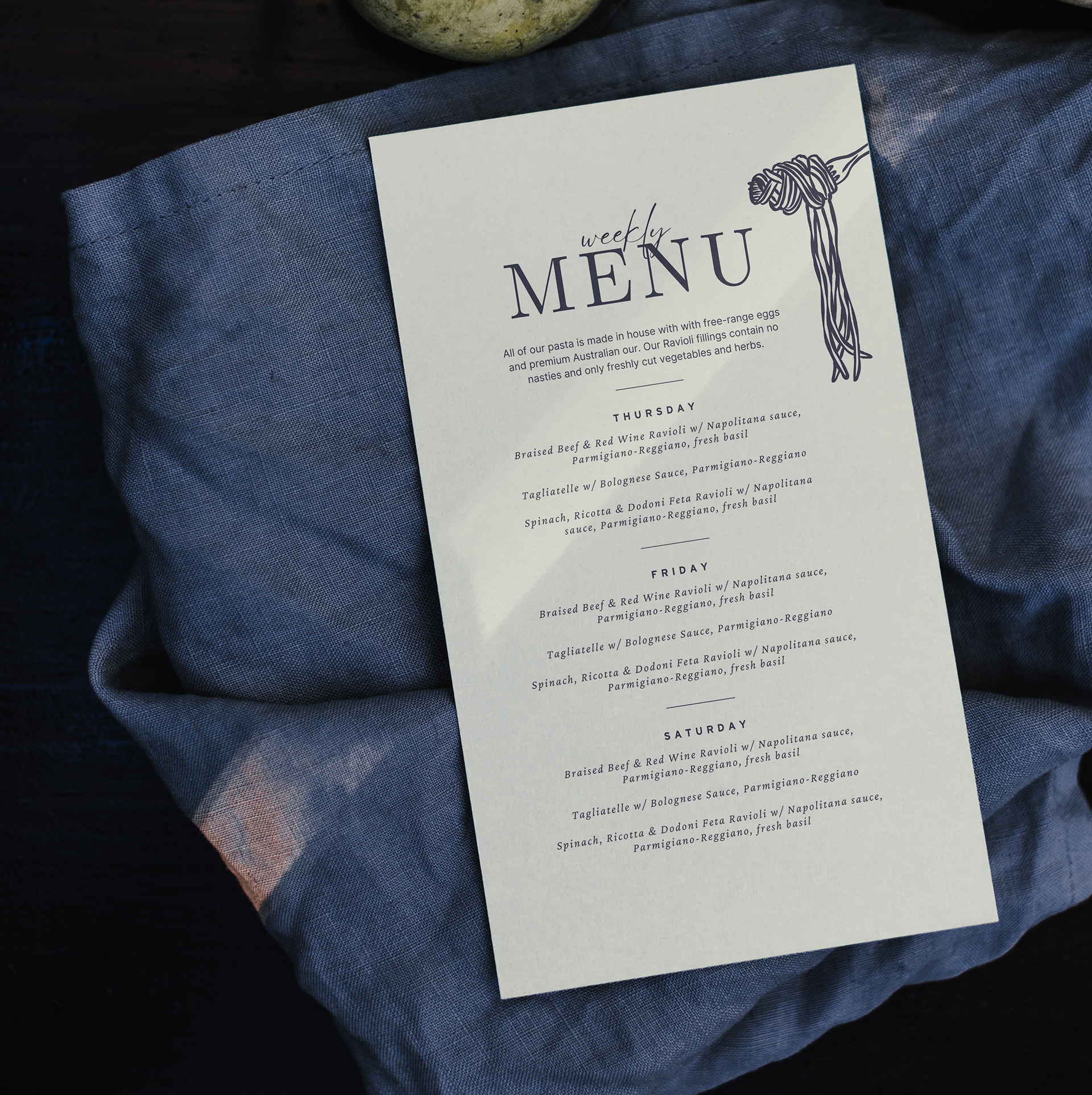 The owners initially wanted their brand mark to feature ravioli, as it was their first product focus. I recommended shifting to a more versatile and universally recognisable pasta—spaghetti. This choice ensured the logo would be clear and memorable across all sizes and applications, while also leaving room for the brand to grow beyond a single pasta type.