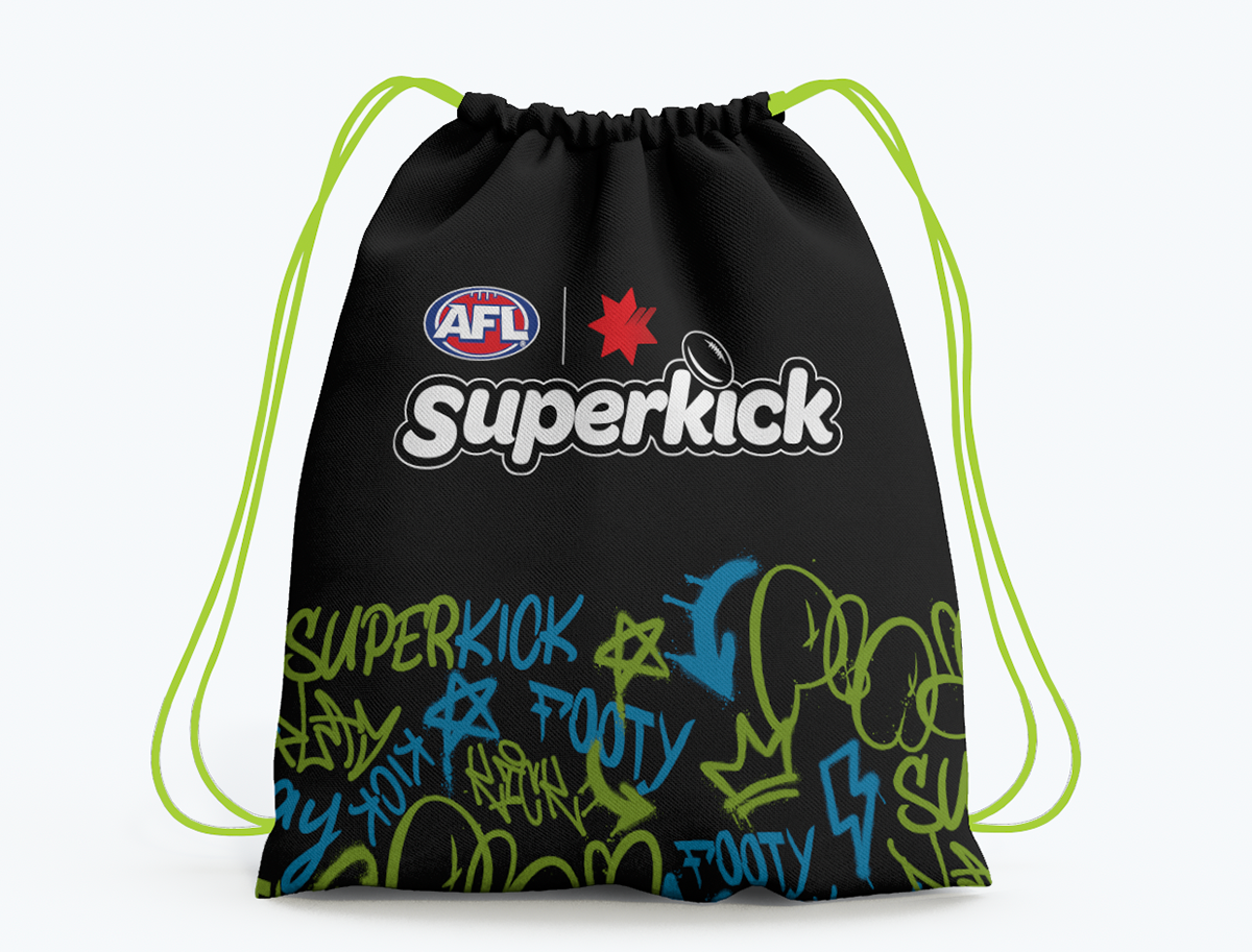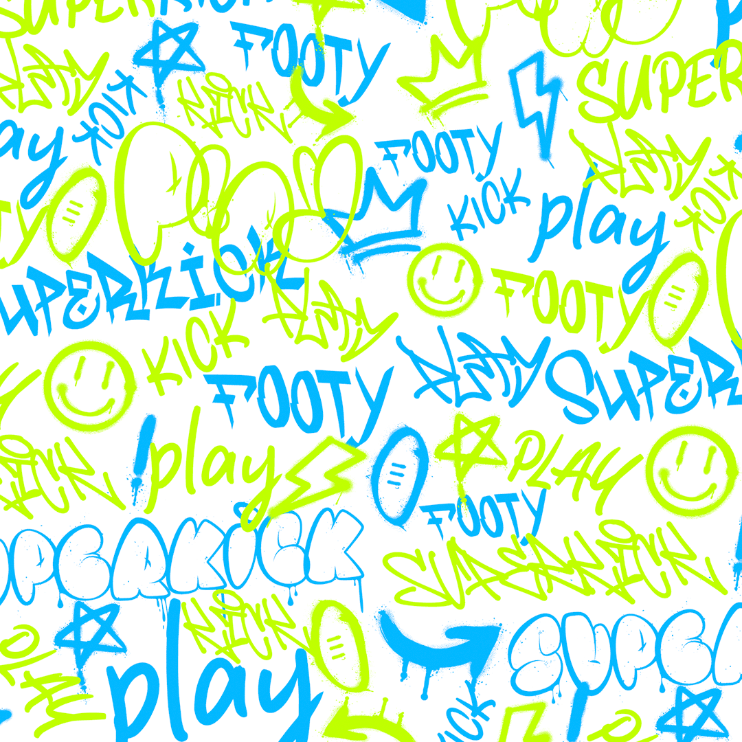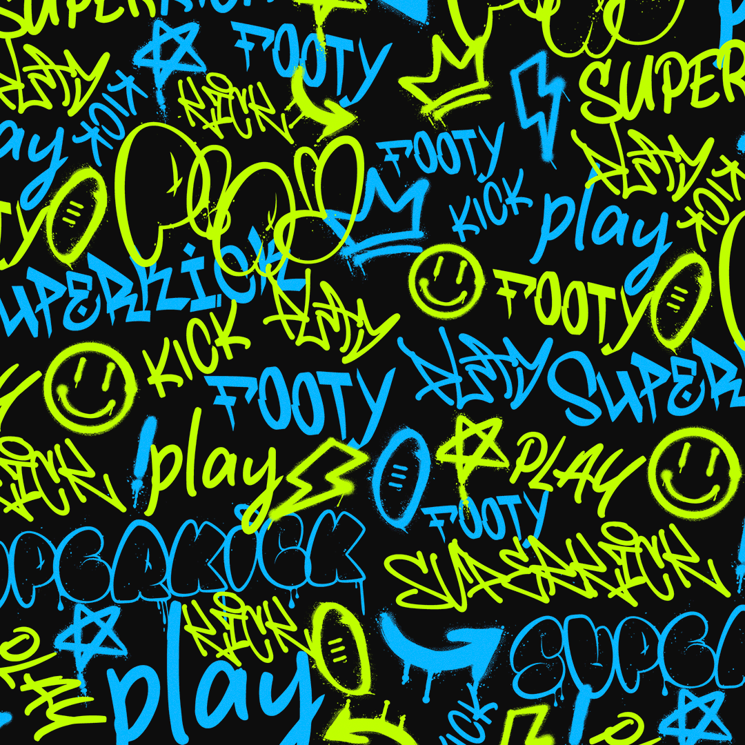 With this in mind, I needed to brand a program that felt older, edgier and distinctly different from Auskick. Instead of Auskick’s playful and youthful typeface, I introduced a more blocky style, paired with bright neon colours against a dark background. A custom footy graffiti pattern tied it all together, giving Superkick a bold and rebellious edge that kids in this age group could connect with.