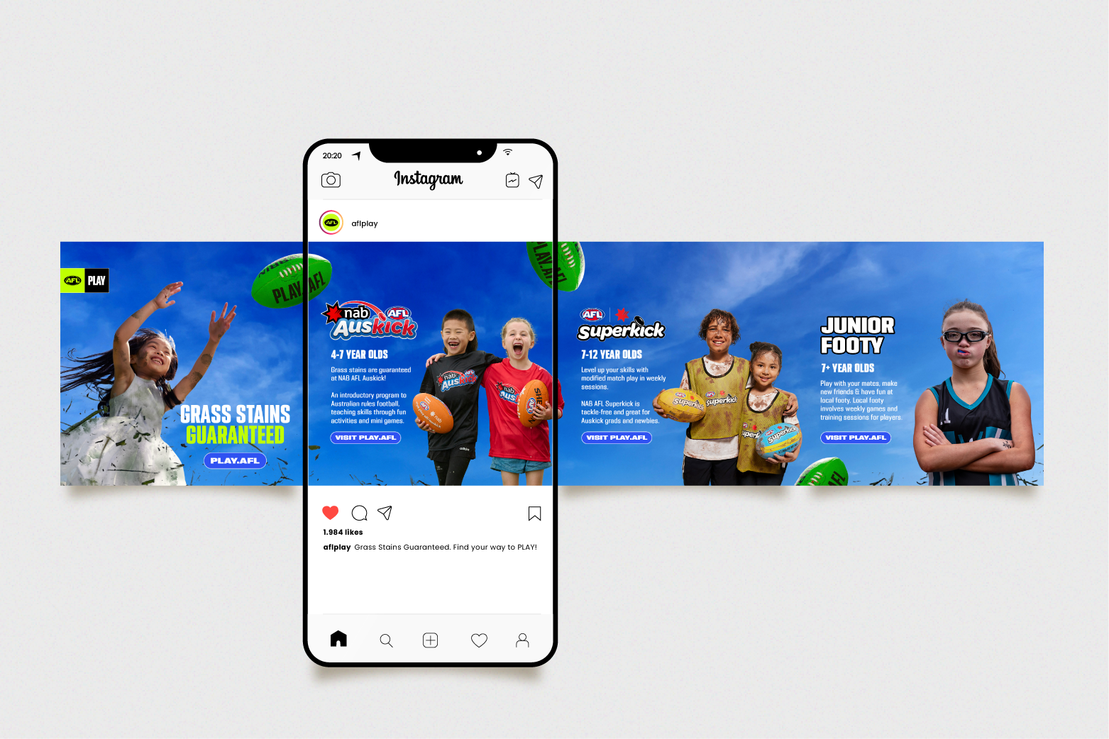It was also important to keep AFL PLAY front and centre as the overarching brand. That balance can be tricky with commercial partners, but subtle touches such as PLAY’s fonts, green footys and our signature PLAY green help bring the brand to life throughout the campaign.